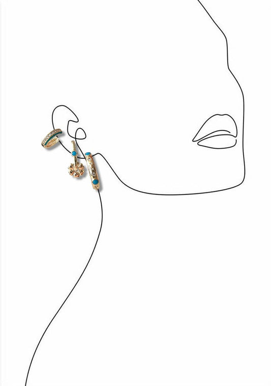 Premium Seri Turkuaz Detaylı 3'lü Halka Küpe Seti - Gold