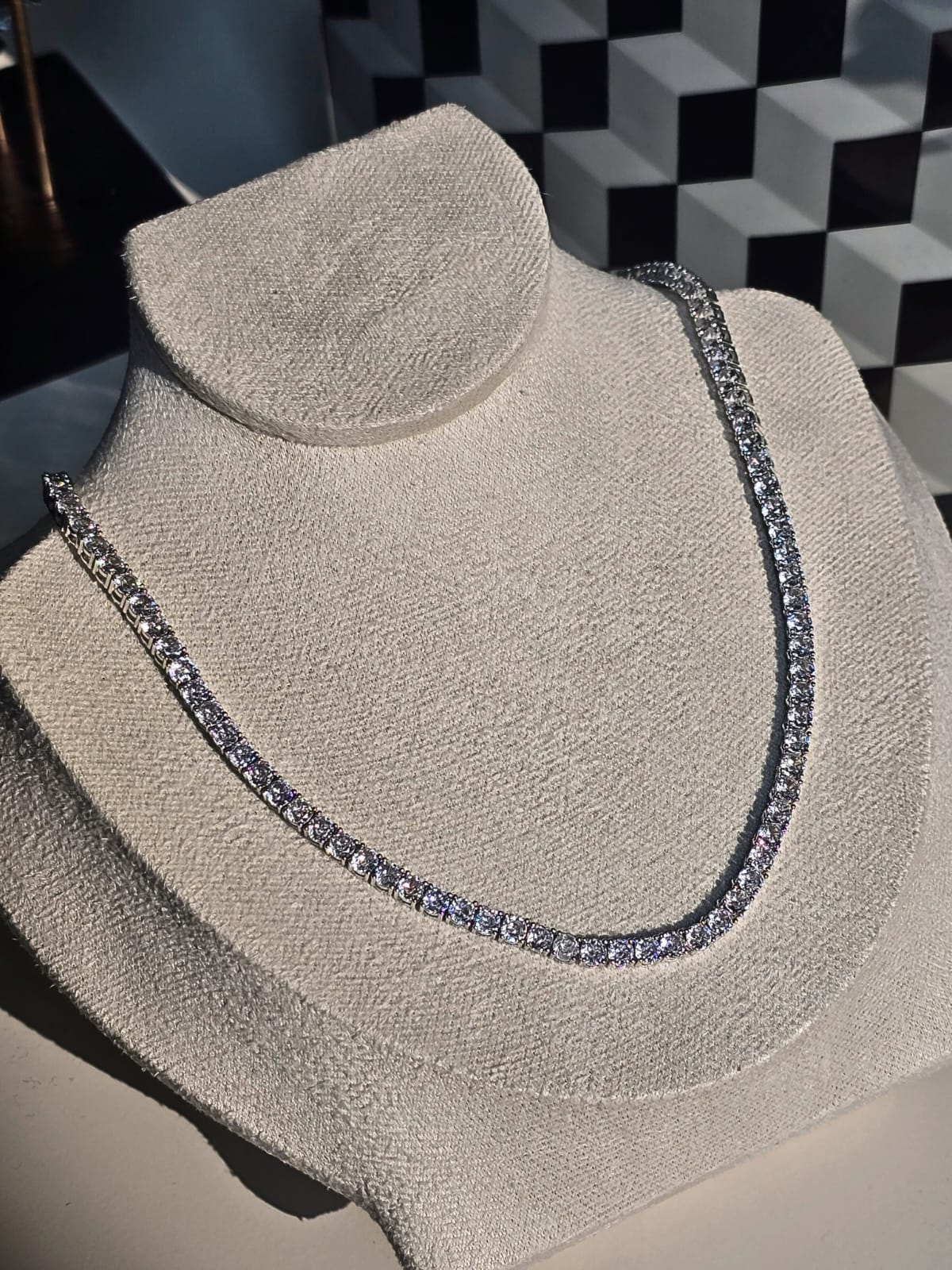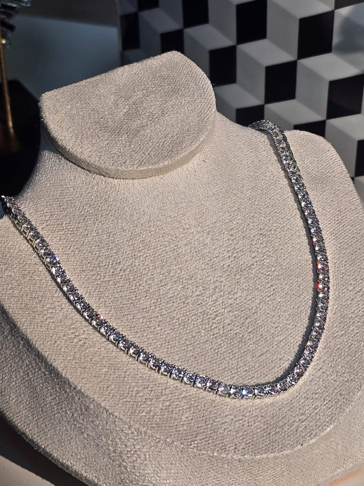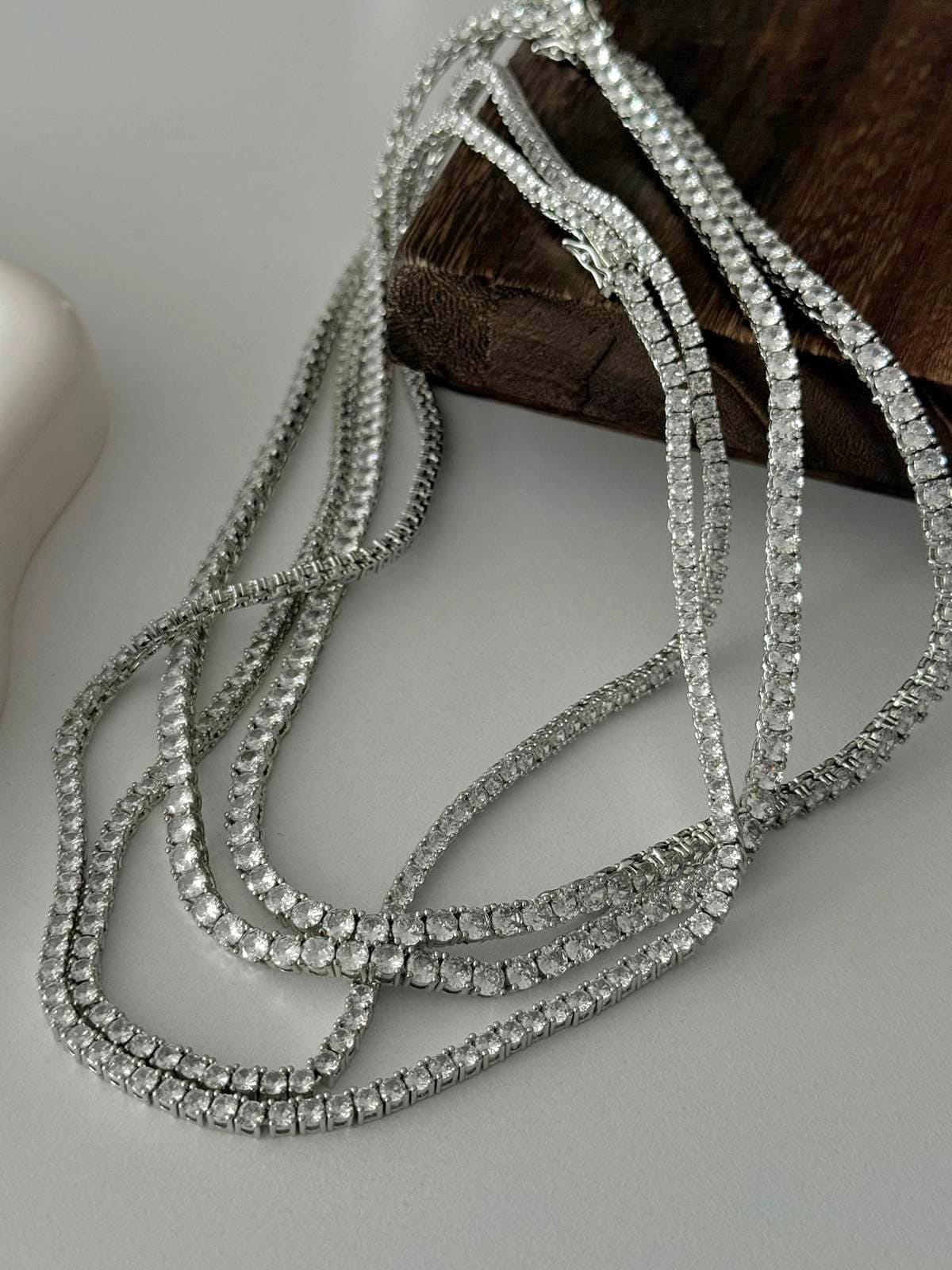 Yaklaşık 40 cm uzunluğundaki bu model, boyun hattına mükemmel bir şekilde oturur ve ışığı her açıdan yansıtan taş dizilimiyle dikkat çeker.