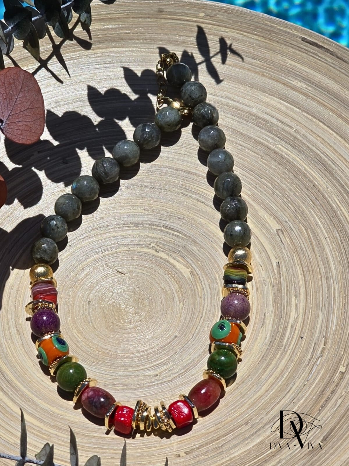 Labradorit taşlarının mistik yansımaları, el yapımı cam nazar boncuklarla birleşerek Eye Mosaic’i ortaya çıkardı.